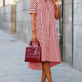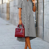 Design: Das Kleid verfügt über ein modisches Streifenmuster, kurze Ärmel und einen Rundhalsausschnitt. Die unregelmäßige Länge und der lässige Schnitt sorgen für einen trendigen, modernen Look.