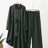 Bringen Sie Stil und Komfort in Ihre Garderobe mit diesem ZahraZen zweiteiligen Set für Damen. Dieses elegante Ensemble besteht aus einem Langarm-Hemd mit Reverskragen und einer weitbeinigen Hose und bietet einen perfekten Mix aus modischem Design und traditioneller Bescheidenheit.